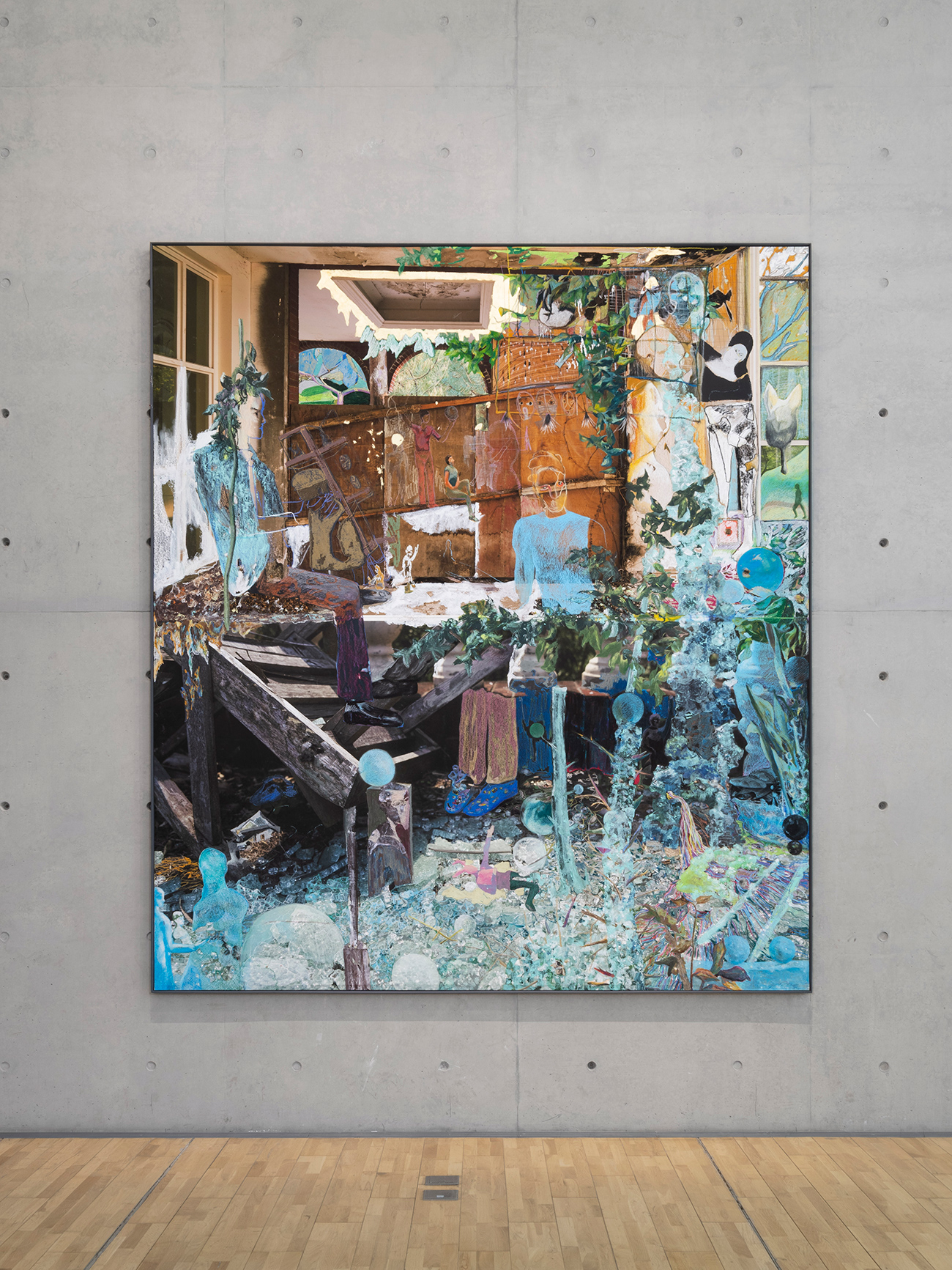 只是,如今的画作《局外人》中荒废的房屋,残留着过去的堂皇,像是一块褪了色的斑驳画布,或者一个时代的童话,留下一些与人相关的身影与往事。而它的一角,早已被植物占领,茂密的杂草打破了人类和自然的边界,衰败与荒芜的空间也无形之中成为自由生长的乐园。