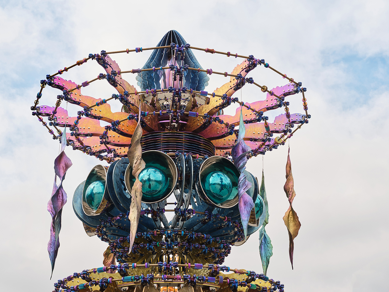 《诞生》由5500件钛金属,1500件铝合金组件及近20000颗不锈钢螺丝构成。725个齿轮与922个人像,在咬合与凝视中,表达命运互联、众生共鸣。在光穿透金属的时刻,机械与人性一同呼吸。器以载道,空容万物。